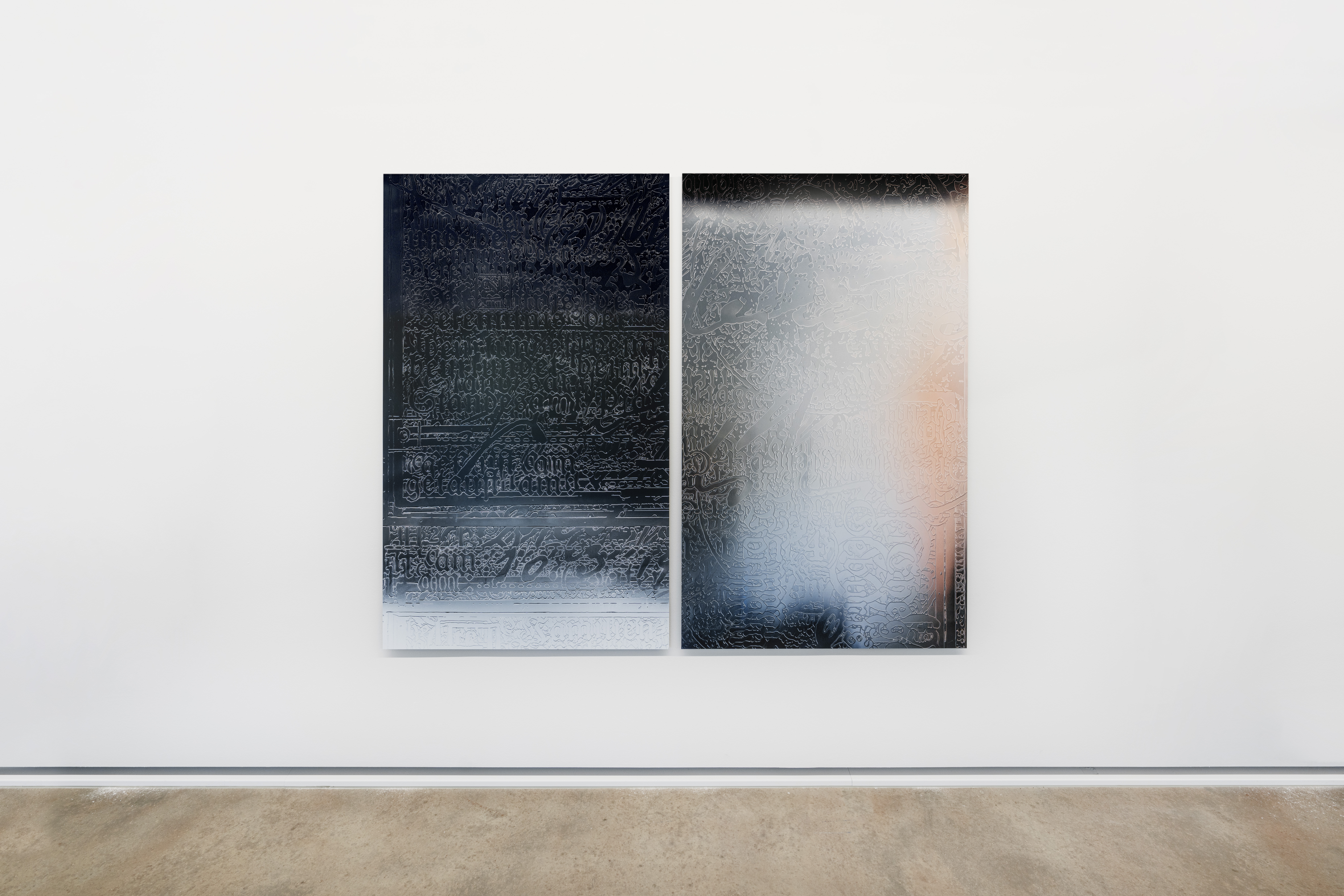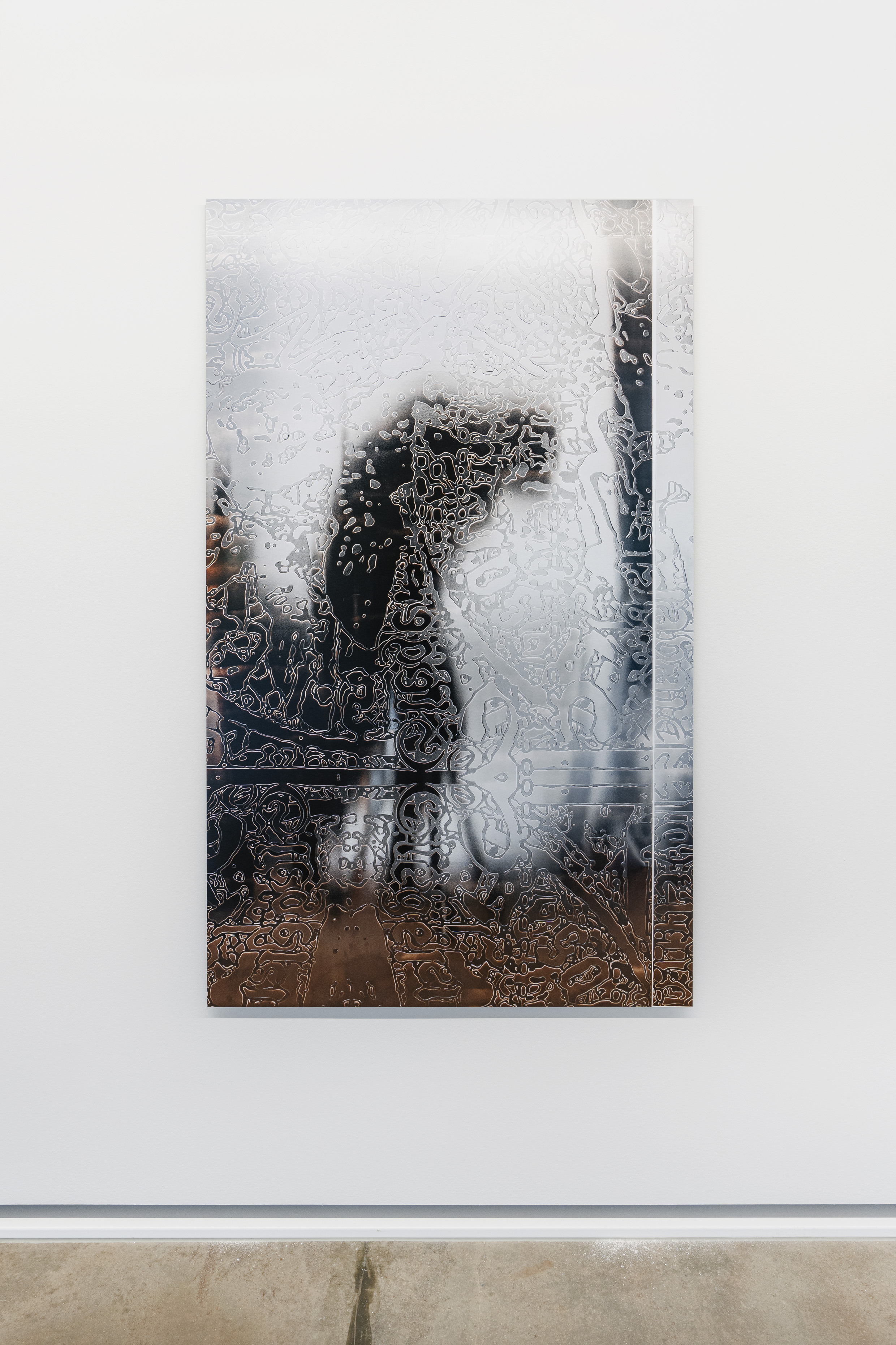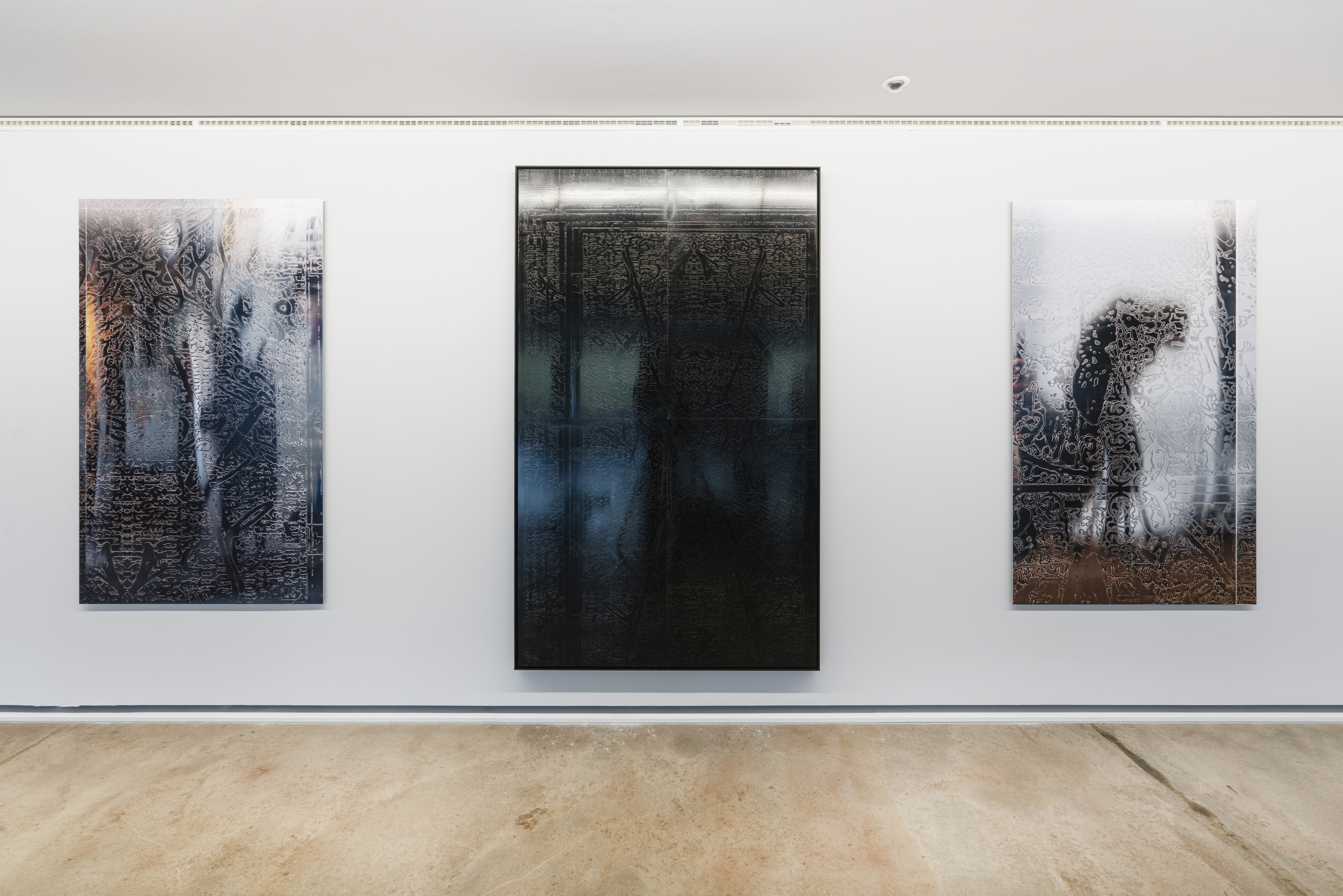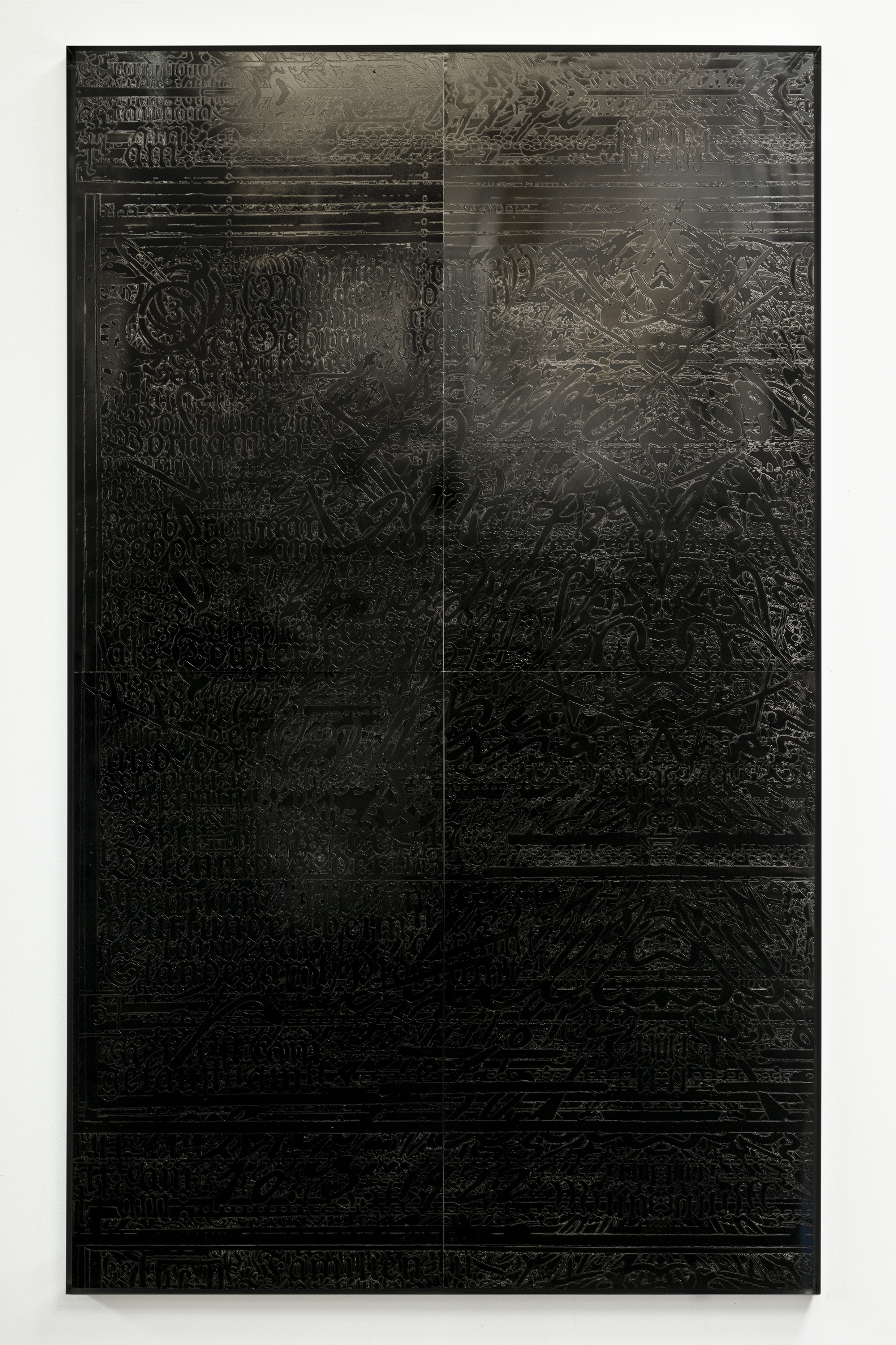 Durch die Anwendung dieser Technik auf den Ahnenpass treten seine grafisch und textlich dominanten Strukturen hervor, gestört und durchkreuzt von handschriftlichen Einträgen, Unterschriften und Reichsadler-Stempeln. Diese wurden wiederum in Ausschnitten und Fragmenten auf Aluminium übertragen und mit schwarzem Lack versiegelt — sie zeigen so eine andere, angeeignete Variante des Dokumentes, auf dessen glänzender Oberfläche sich Betrachter:innen und Räumlichkeiten spiegeln.