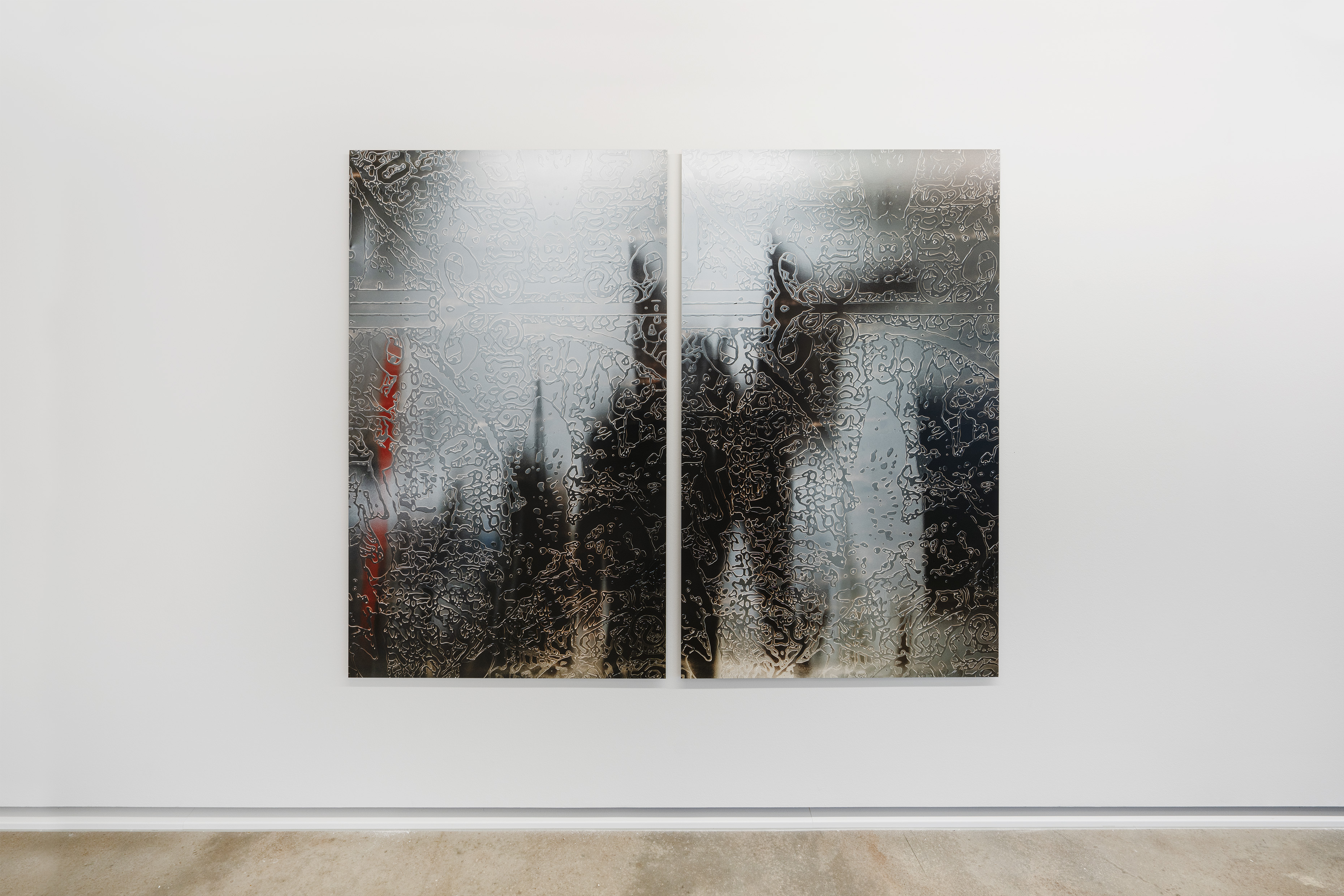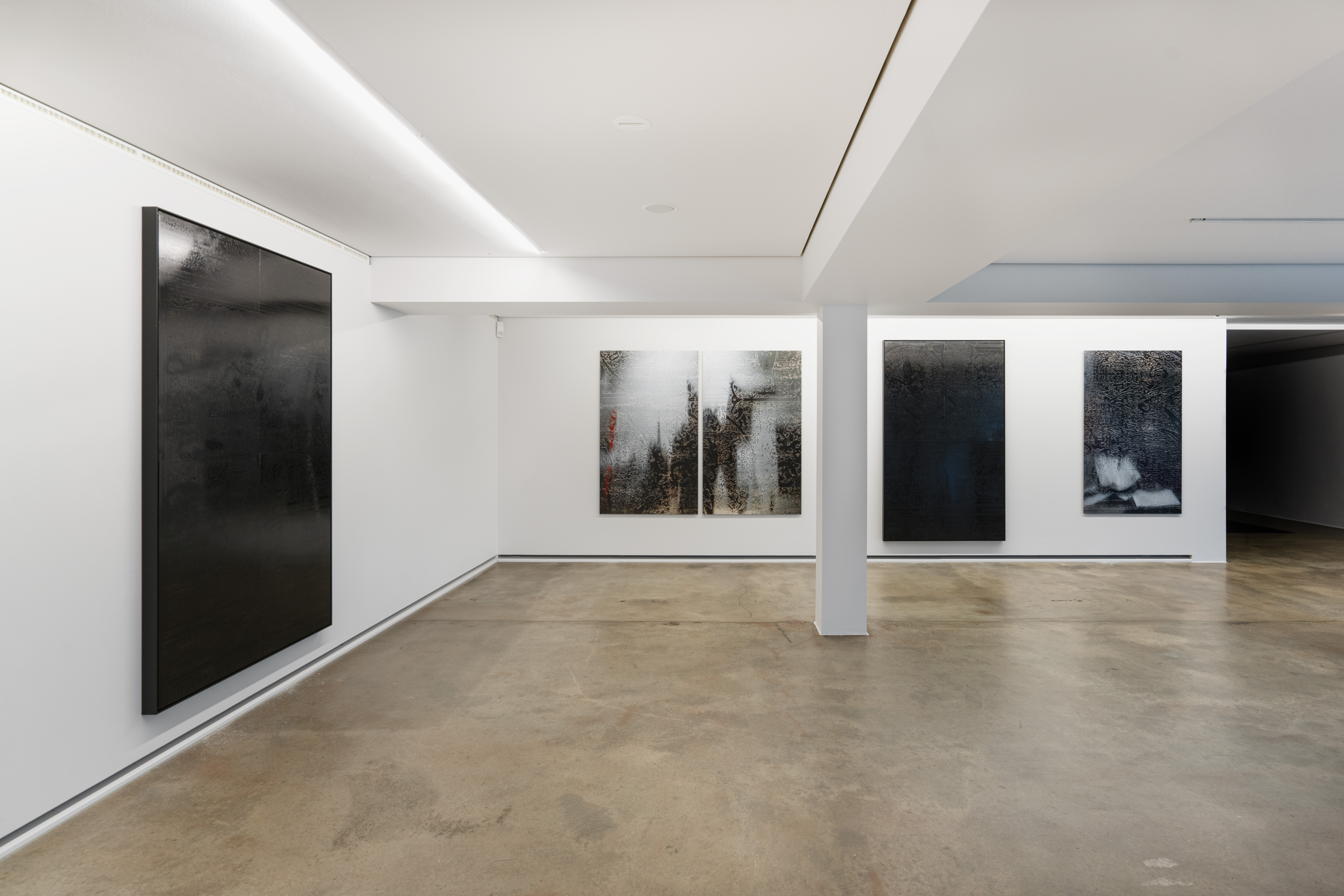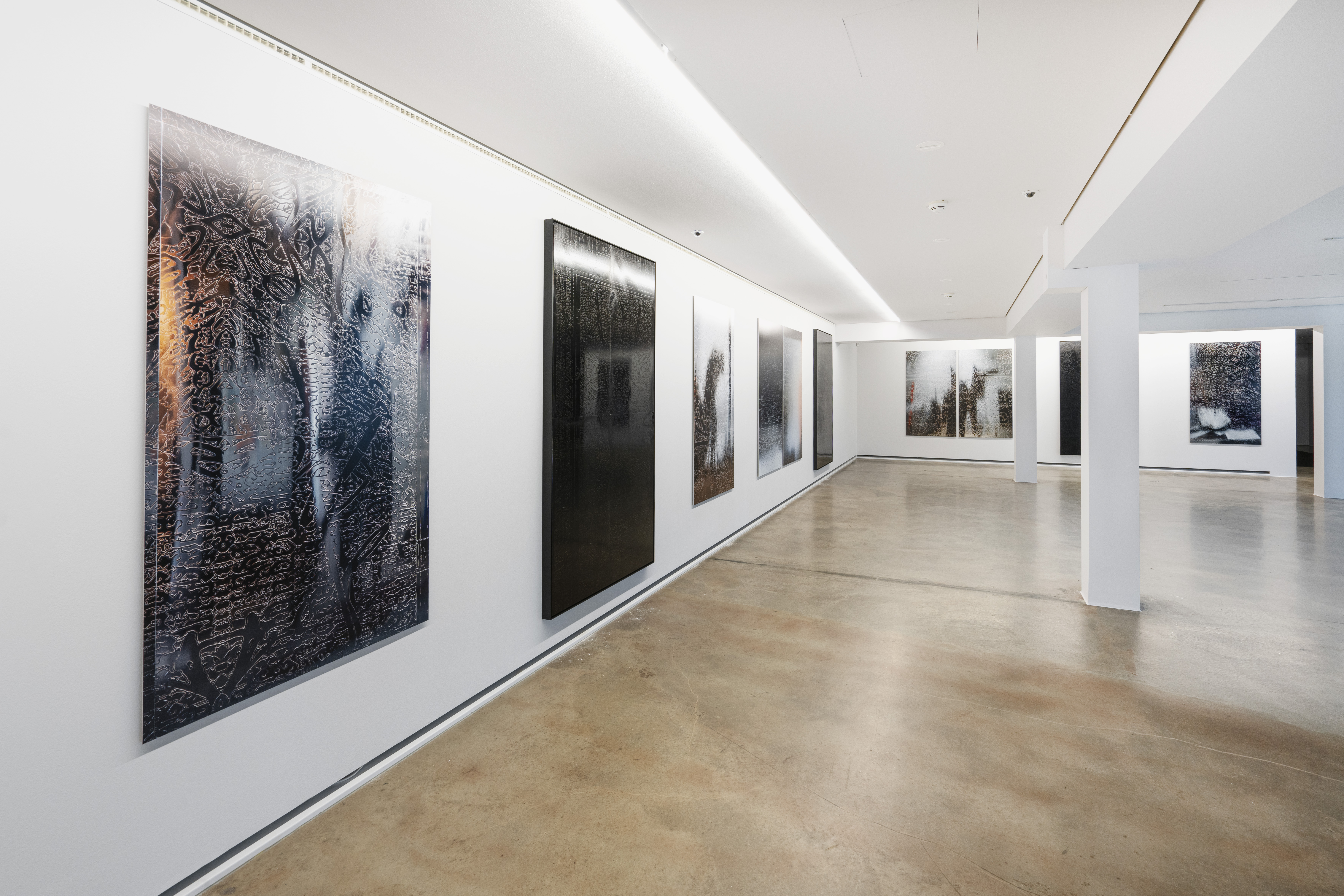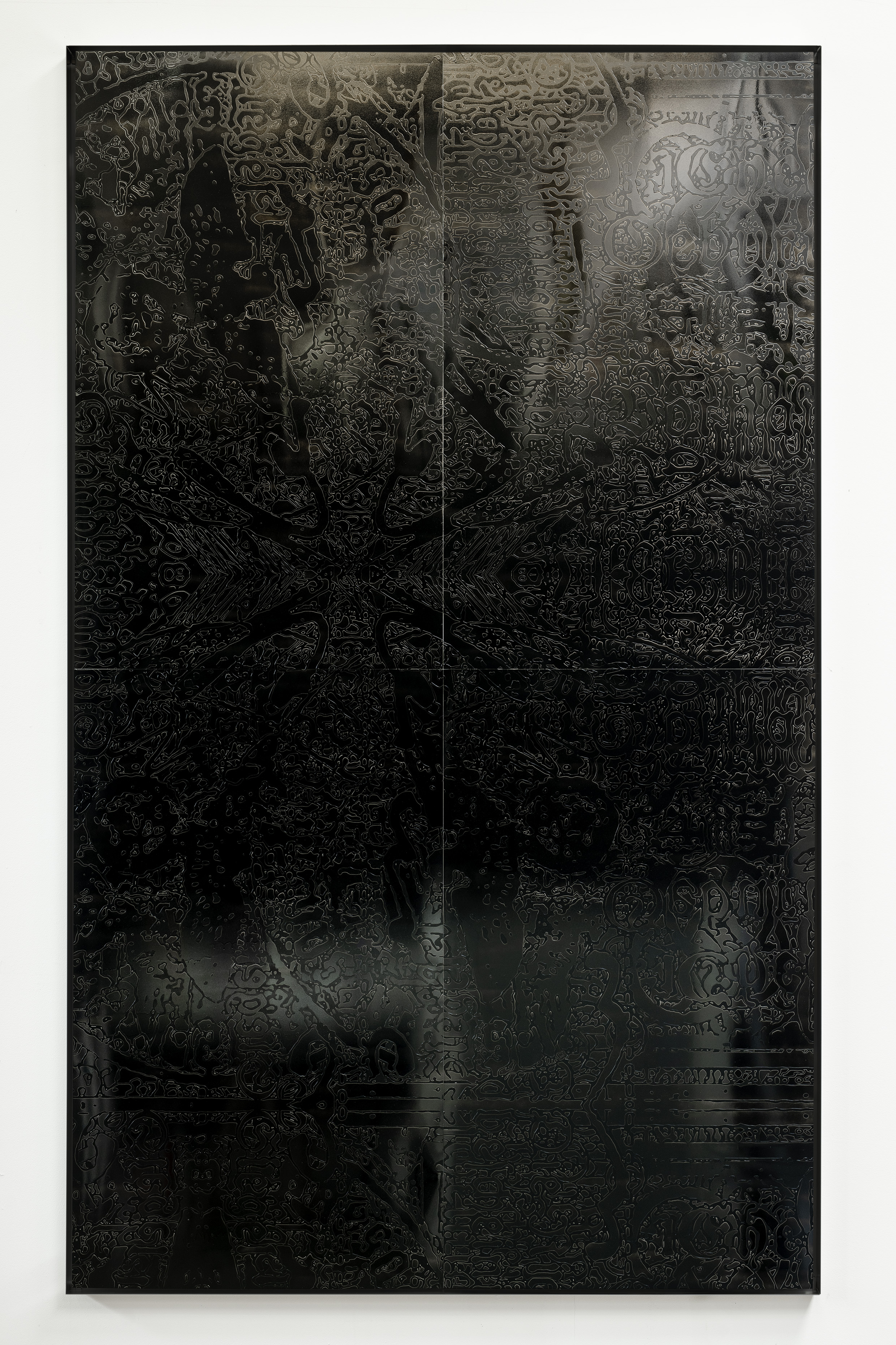 Durch die Anwendung dieser Technik auf den Ahnenpass treten seine grafisch und textlich dominanten Strukturen hervor, gestört und durchkreuzt von handschriftlichen Einträgen, Unterschriften und Reichsadler-Stempeln. Diese wurden wiederum in Ausschnitten und Fragmenten auf Aluminium übertragen und mit schwarzem Lack versiegelt — sie zeigen so eine andere, angeeignete Variante des Dokumentes, auf dessen glänzender Oberfläche sich Betrachter:innen und Räumlichkeiten spiegeln.