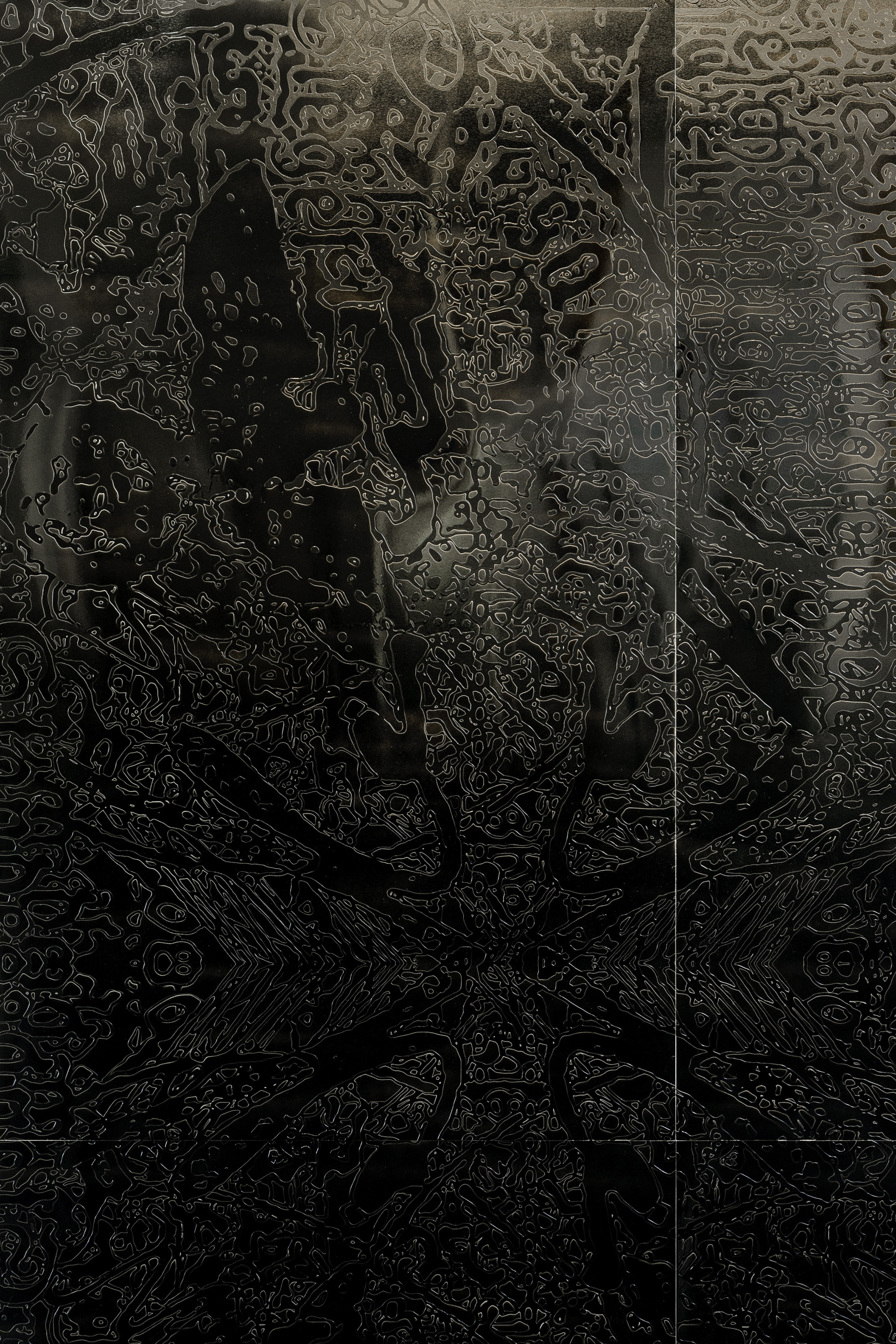 Der sogenannte Ahnenpass diente im Deutschen Reich zwischen 1933 – 1945 dem Nachweis der „arischen Herkunft“ seiner Träger:innen, und wies ihnen den bürokratisch verifizierten Stand legitimer Bürger:innen des damaligen Nationalstaates zu. Die Werkgruppe Soft Pass ist eine vertiefte Auseinandersetzung mit dem Ahnenpass meines Urgroßvaters, und zeigt schwarze, reflektierende Reliefs zusammen mit Fotografien, die von ihnen ausgehend entstanden sind. Grundlage für die Reliefs ist eine sogenannte Composite – Fotografie, bei der alle Doppelseiten des Dokumentes fotografisch digitalisiert und übereinander geschichtet wurden —