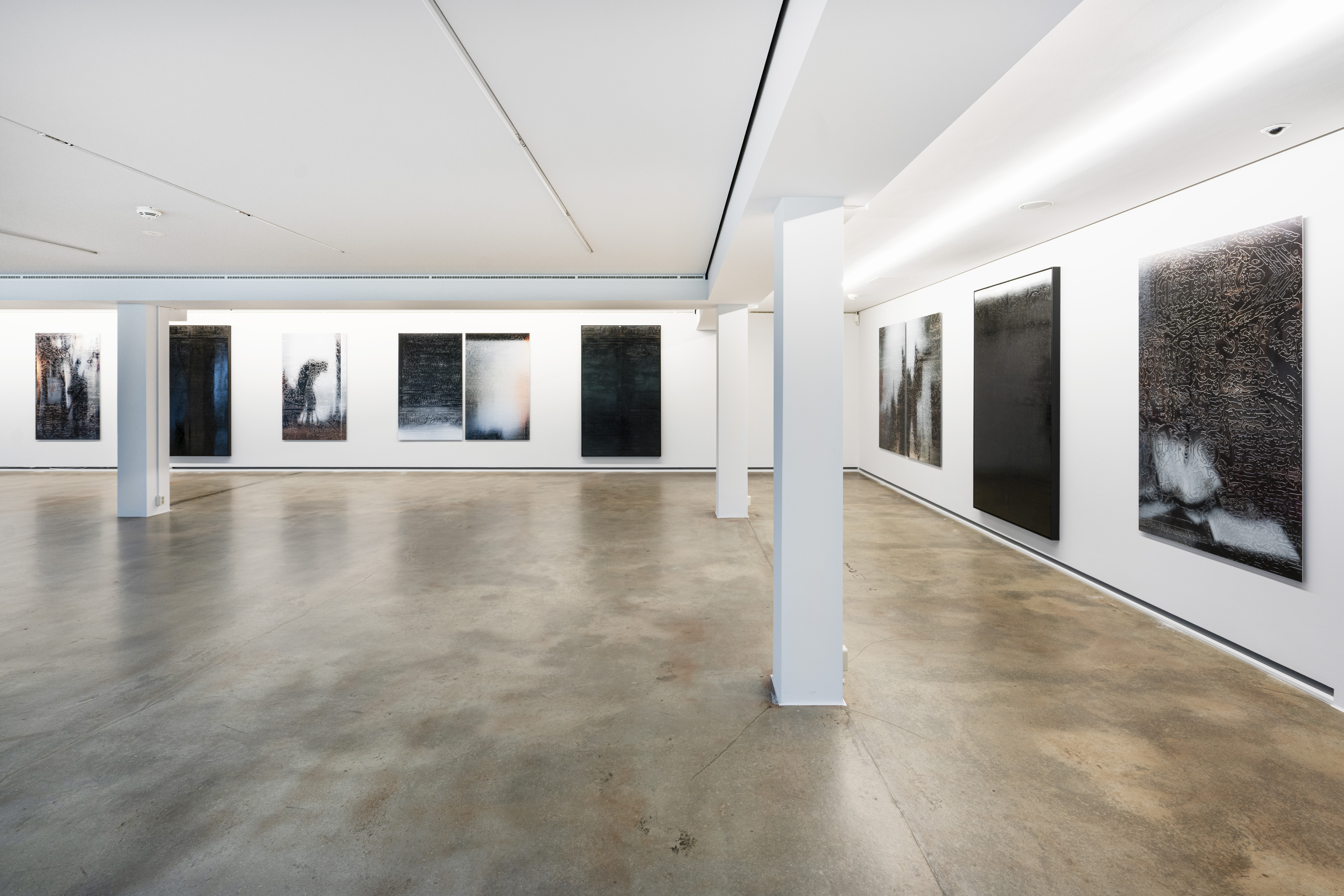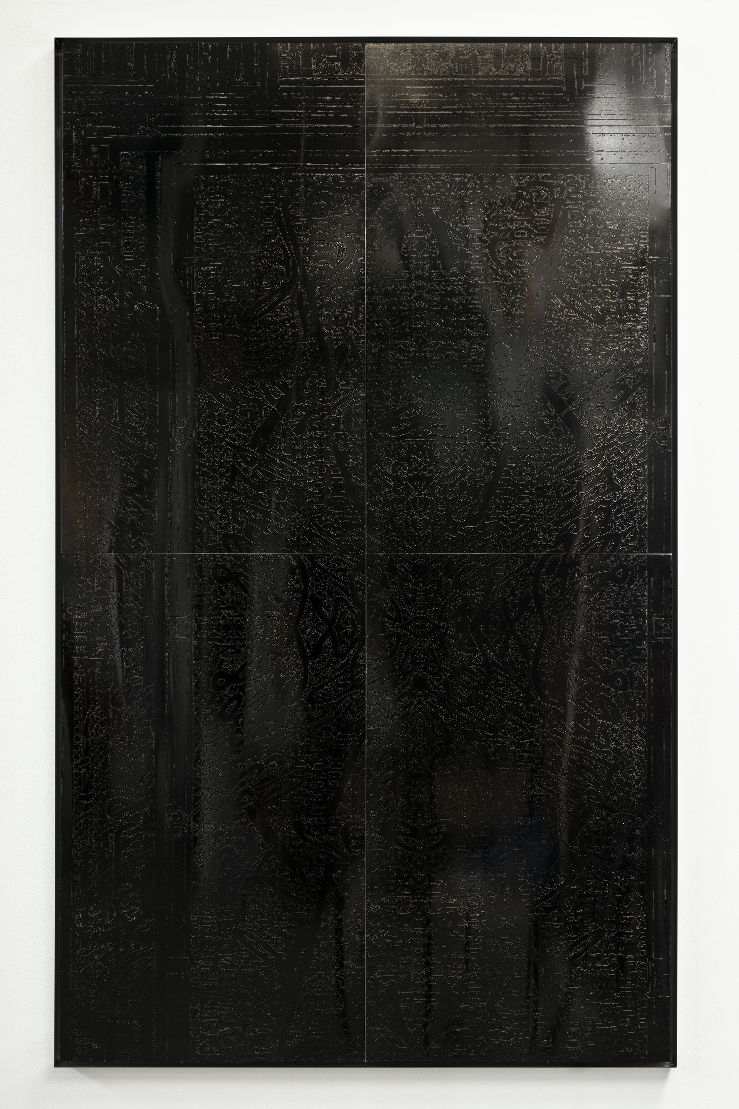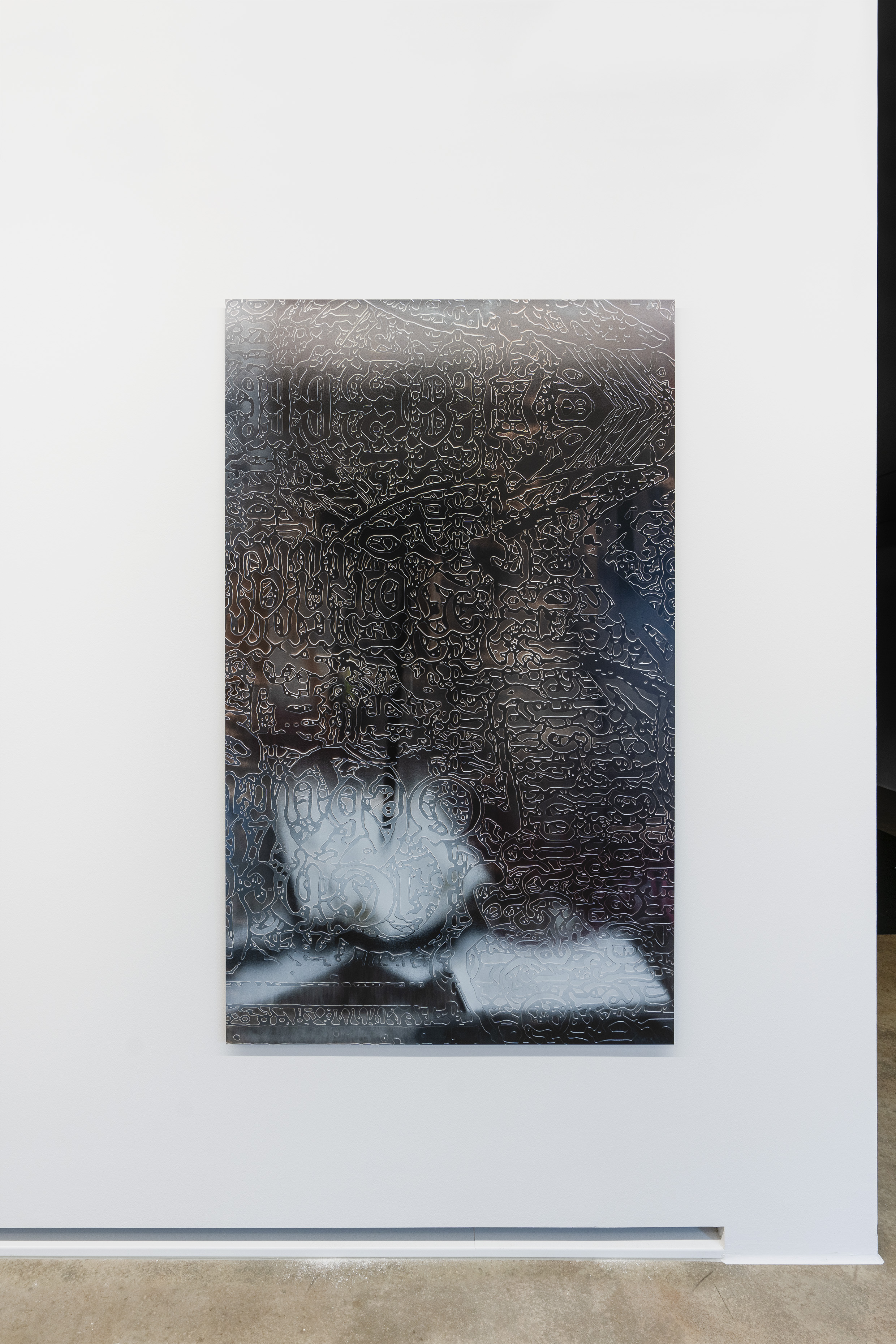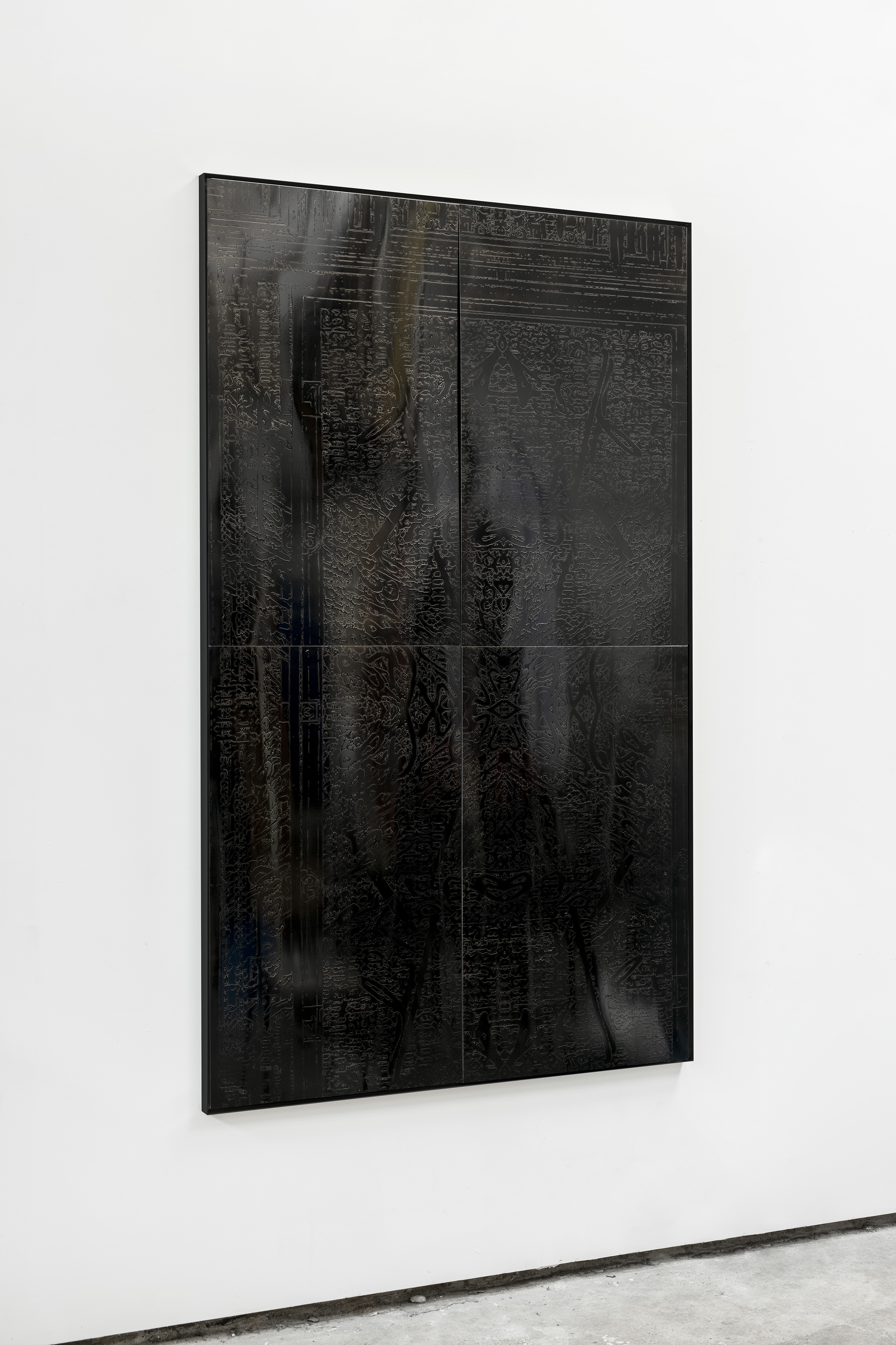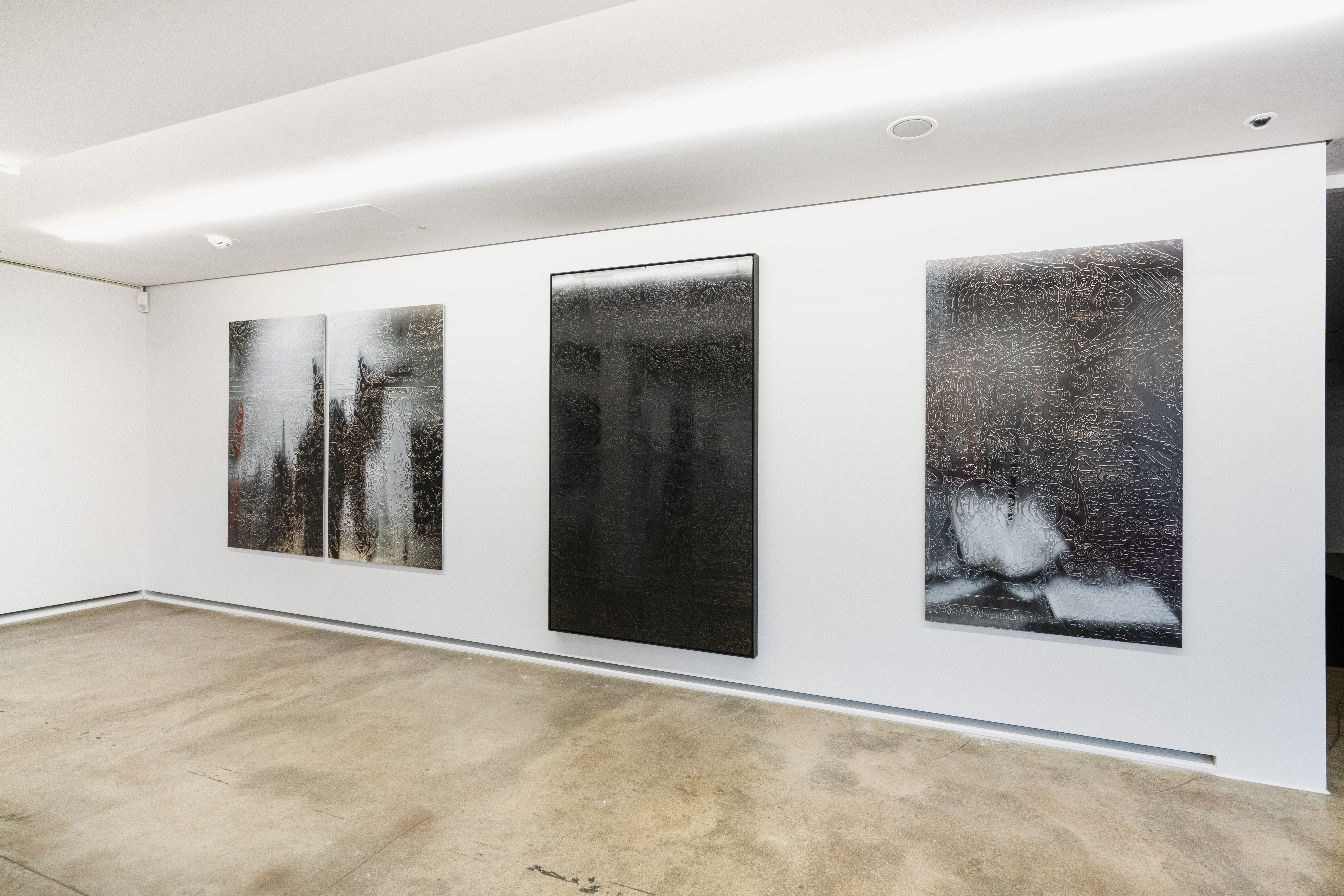 Durch die Anwendung dieser Technik auf den Ahnenpass treten seine grafisch und textlich dominanten Strukturen hervor, gestört und durchkreuzt von handschriftlichen Einträgen, Unterschriften und Reichsadler-Stempeln. Diese wurden wiederum in Ausschnitten und Fragmenten auf Aluminium übertragen und mit schwarzem Lack versiegelt — sie zeigen so eine andere, angeeignete Variante des Dokumentes, auf dessen glänzender Oberfläche sich Betrachter:innen und Räumlichkeiten spiegeln.