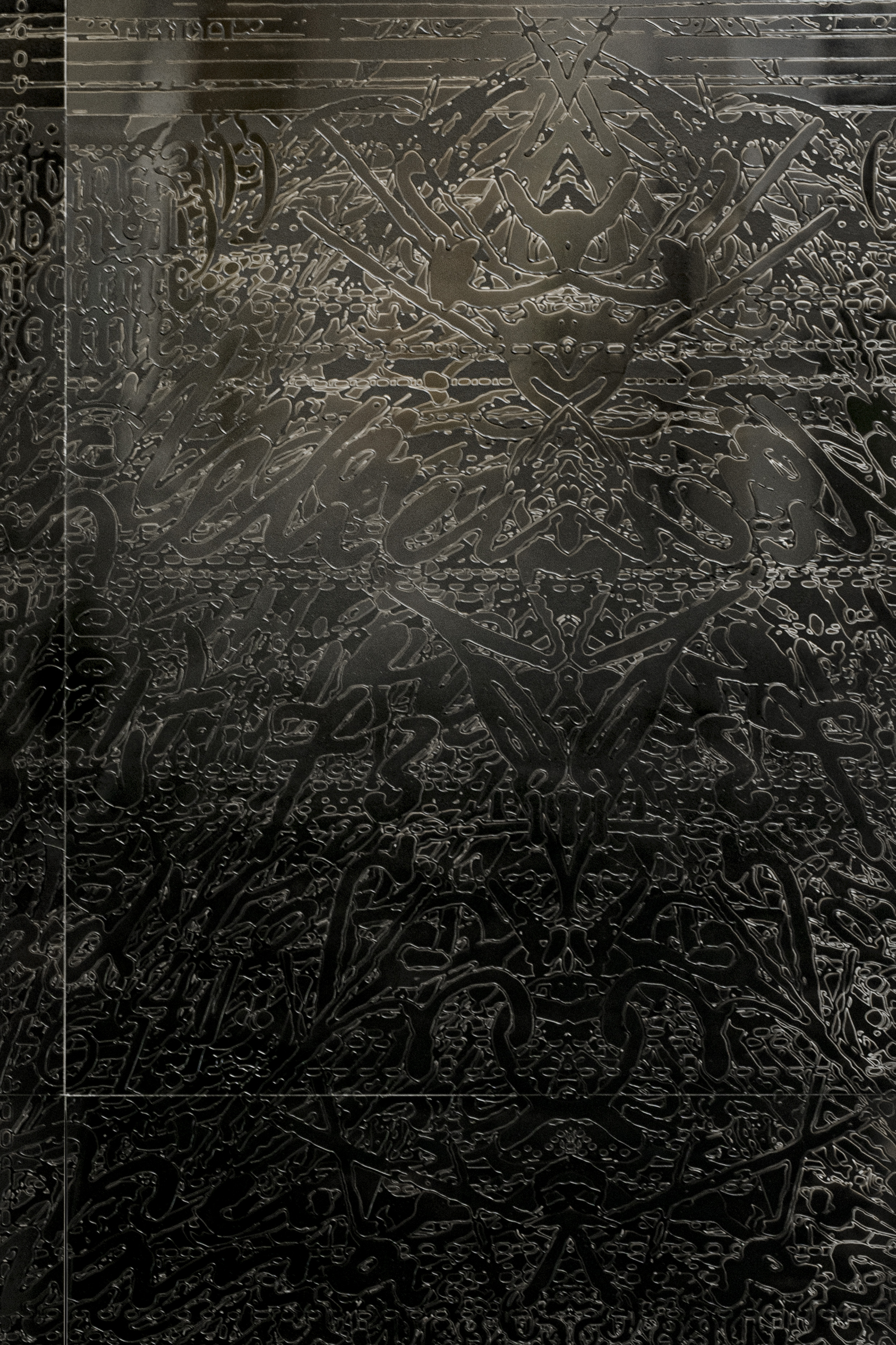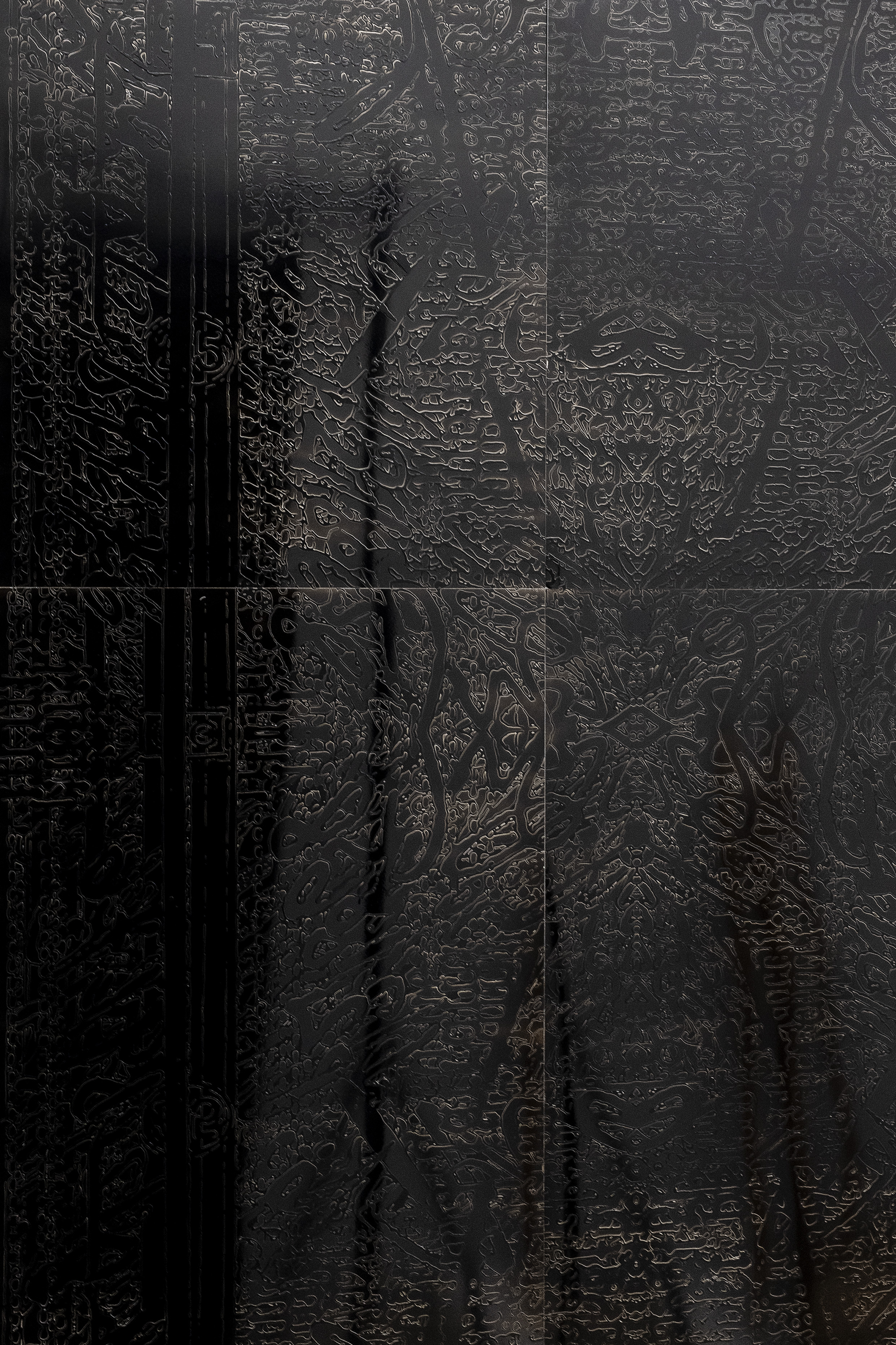 Der sogenannte Ahnenpass diente im Deutschen Reich zwischen 1933 – 1945 dem Nachweis der „arischen Herkunft“ seiner Träger:innen, und wies ihnen den bürokratisch verifizierten Stand legitimer Bürger:innen des damaligen Nationalstaates zu. Die Werkgruppe Soft Pass ist eine vertiefte Auseinandersetzung mit dem Ahnenpass meines Urgroßvaters, und zeigt schwarze, reflektierende Reliefs zusammen mit Fotografien, die von ihnen ausgehend entstanden sind. Grundlage für die Reliefs ist eine sogenannte Composite – Fotografie, bei der alle Doppelseiten des Dokumentes fotografisch digitalisiert und übereinander geschichtet wurden —